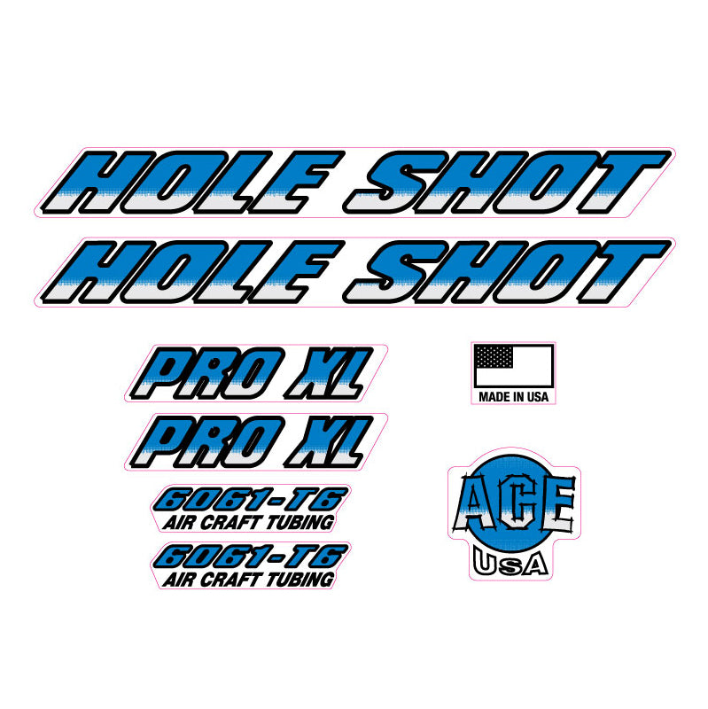 Replacement Ace Hole Shot Pro XL decal set. If you are restoring an old 1994 Ace Hole Shot Pro XL BMX, you may need to replace the decals stickers. This full decal set are reproductions based on the original Ace Hole Shot decal design as close as possible.