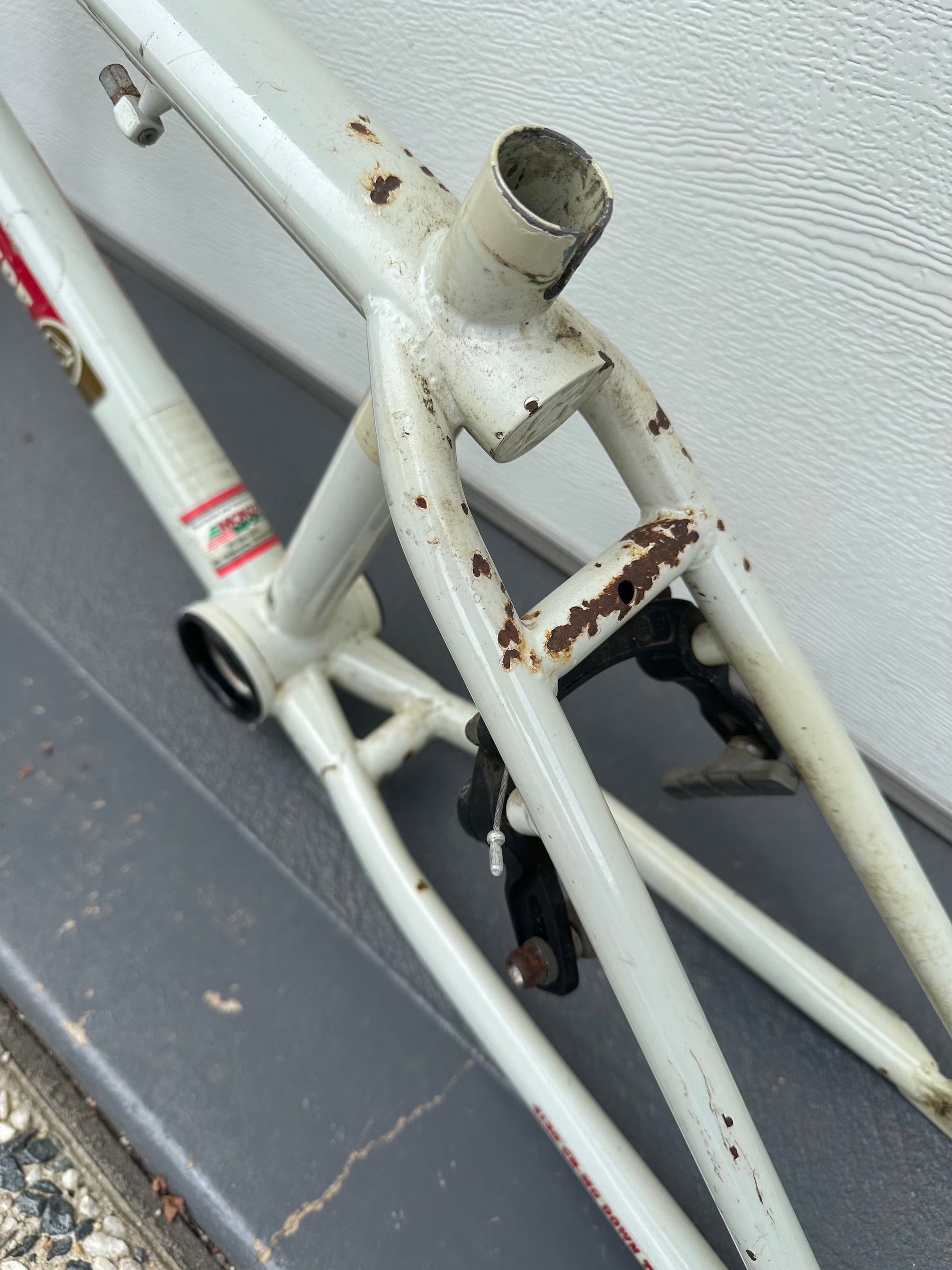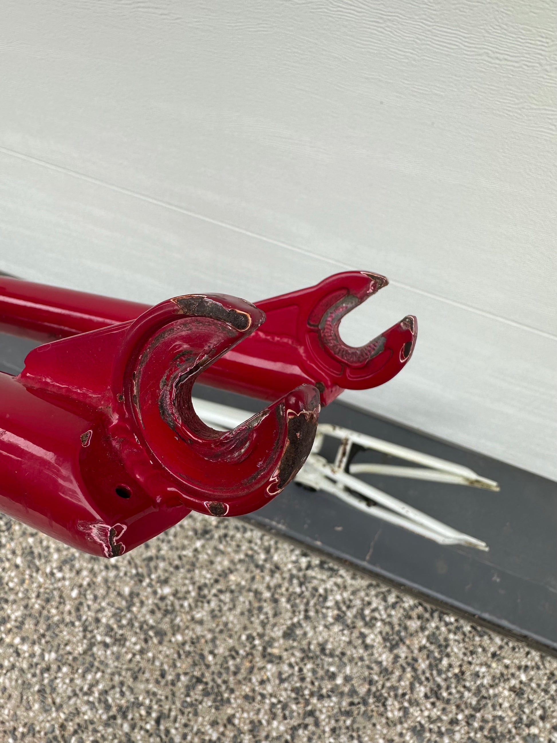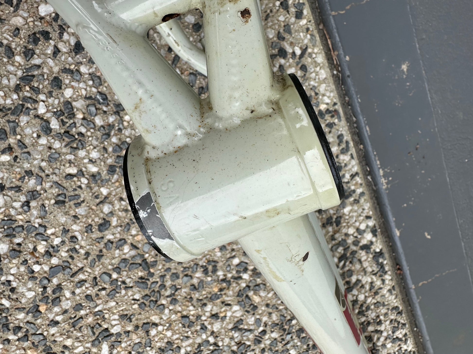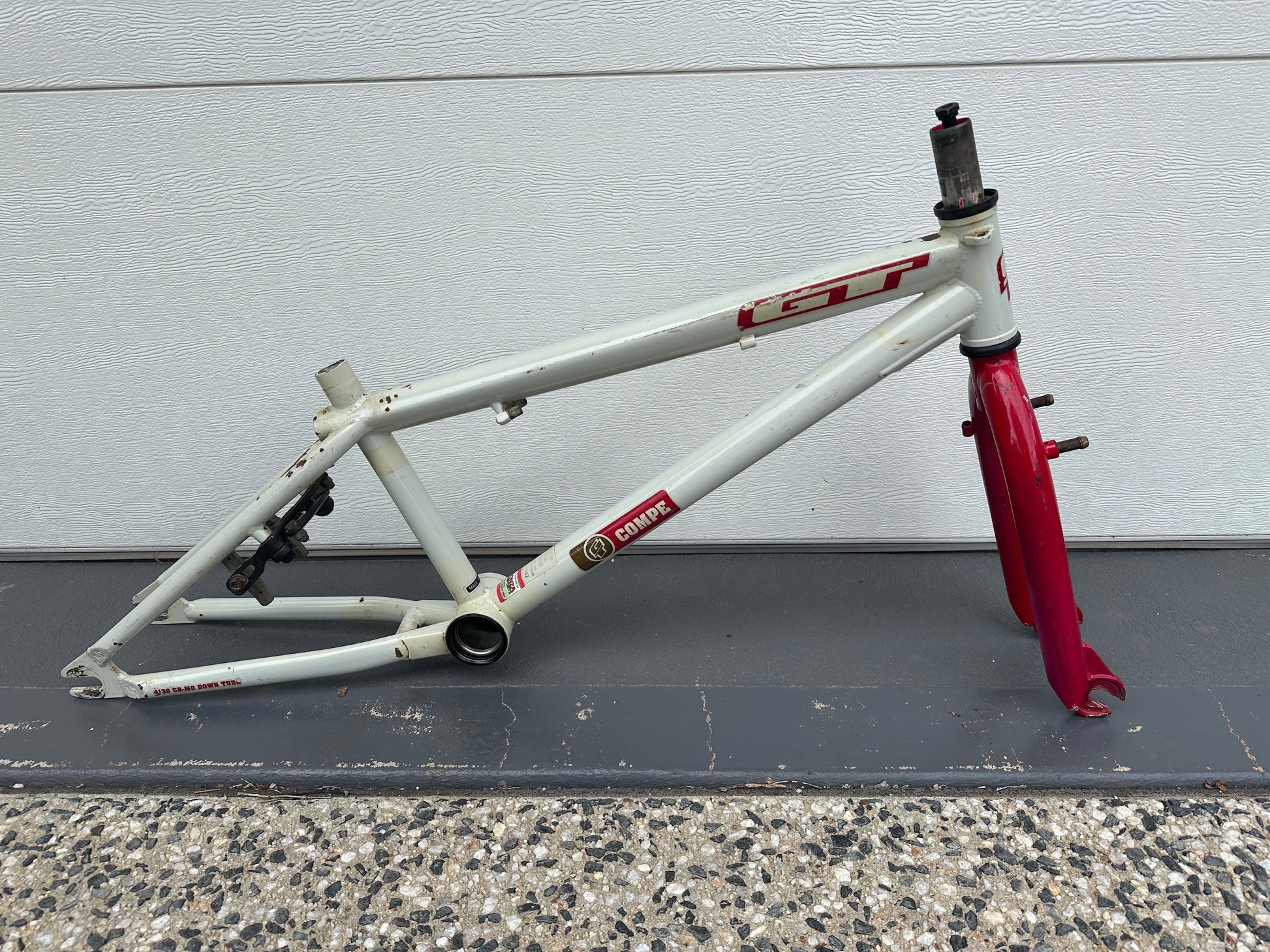 2007 GT Compe BMX Frame and Fork. This frame set is in very good original survivor condition with no bends, cracks or damage and the forks are straight. It does have a few minor scratches with a little bit of rust on those scratches, but this can be expected on a near 20 year old BMX frame.