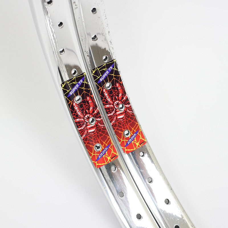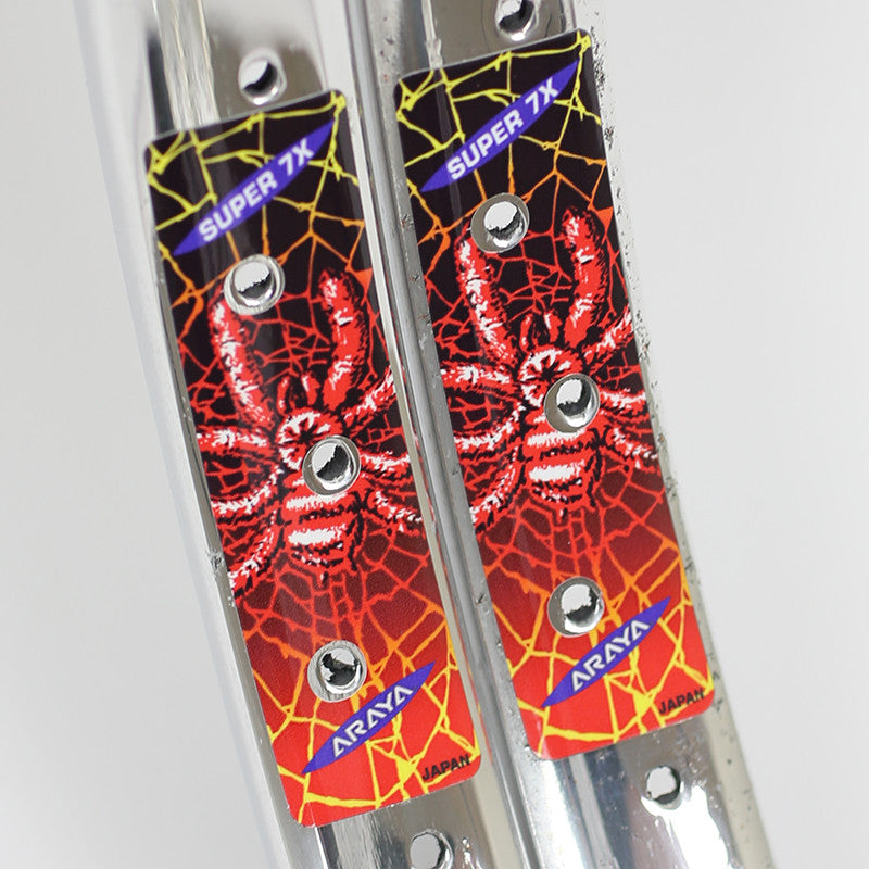 Replacement Araya Super 7x decal set. If you are restoring old BMX wheels, you may need to replace the 'Spider' decals stickers on your Araya Super 7x 48H rims. This full decal set are reproductions of the original Araya 7x BMX 'Spider' design, re-created as close as possible.