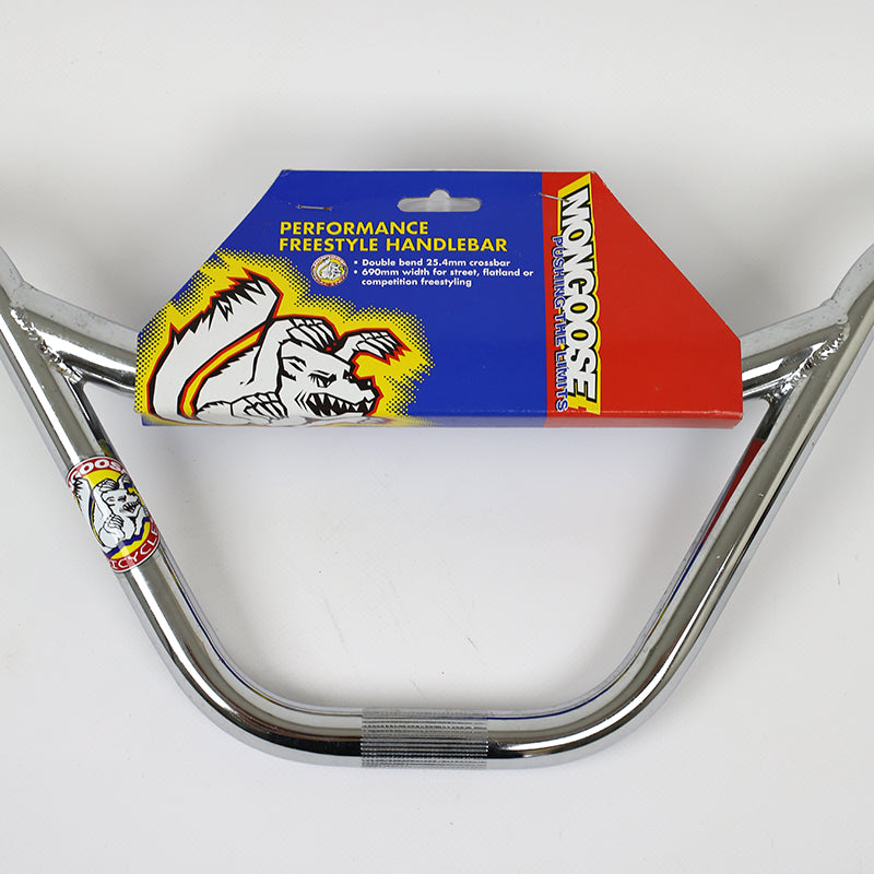 Mid school 90's, chrome Mongoose freestyle BMX handlebars. These handlebars were made in 1997 and used stock on the 1997 and 1998 Mongoose Sniper, Villain and Rogue however also suitable for Hooligan and DMC bikes also. Brand new, perfect replacement seat for mid-school Mongoose freestyle BMX bike restoration and rebuilds. Classic double bend design. 690mm width for street, flatland or freestyle BMX.